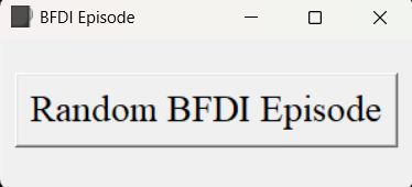 A button that takes you to any BFDI episode. Just load the program and click the button! Features every episode from BFDI 1 to BFDIE 3 as of now. BFDI made by Michael and Cary Huang, I do not own any of these episodes